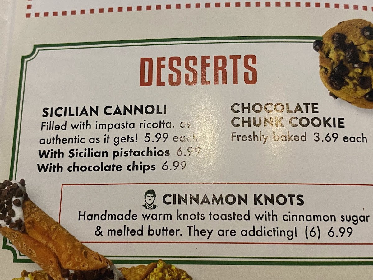 Filled with impasta ricotta, as authentic as it gets! With sicilian pistachios 6.99 With chocolate chips 6.99